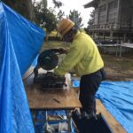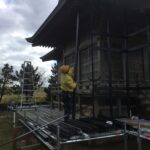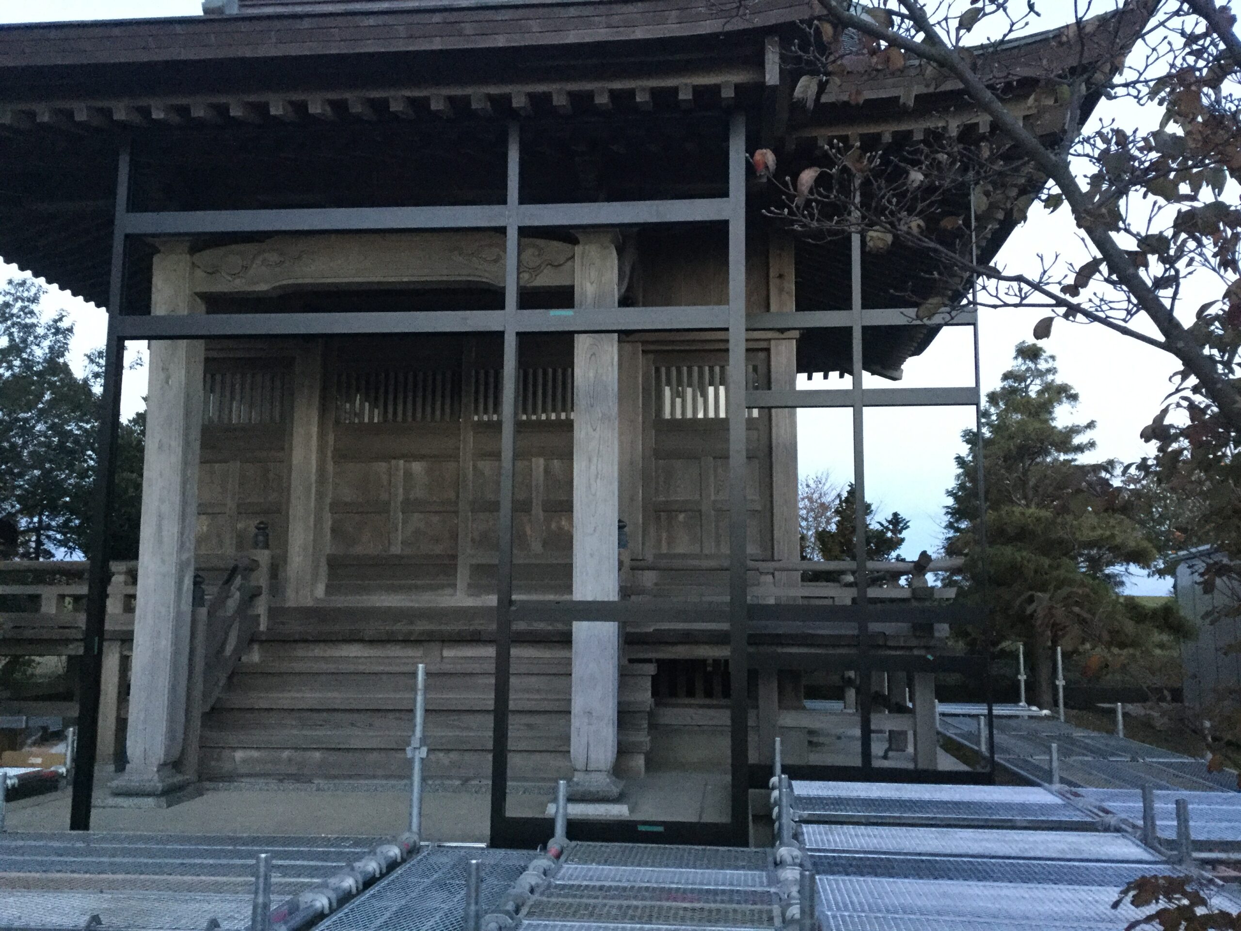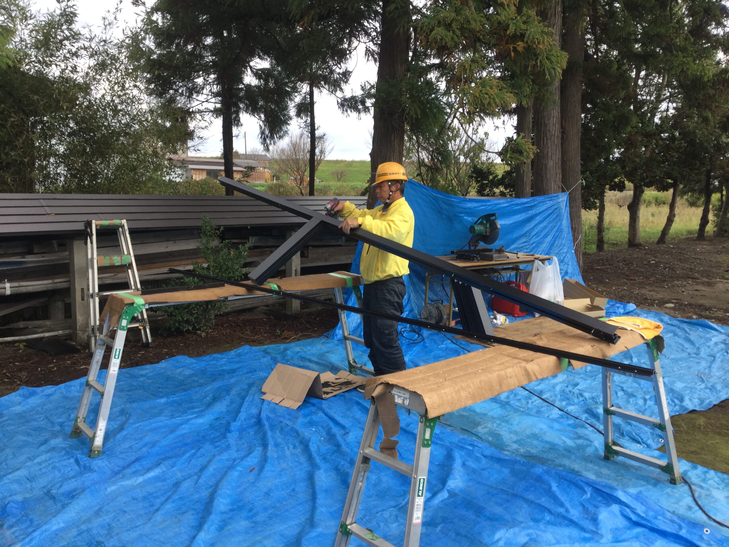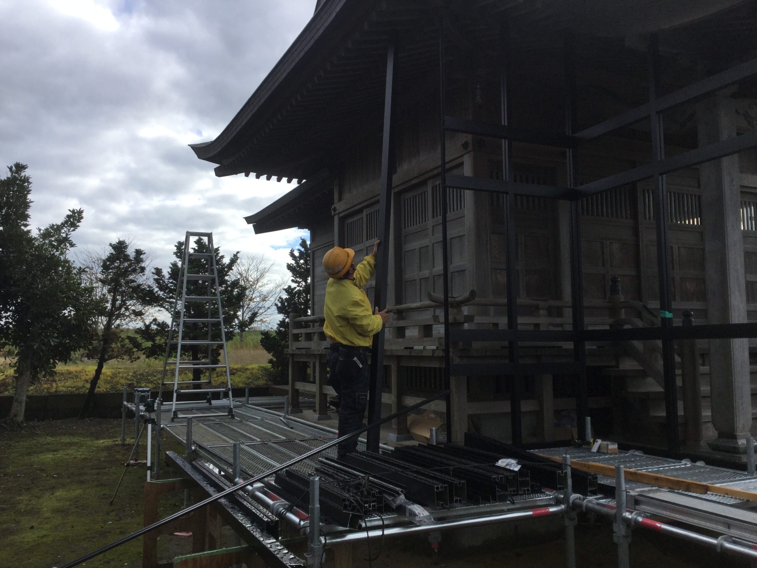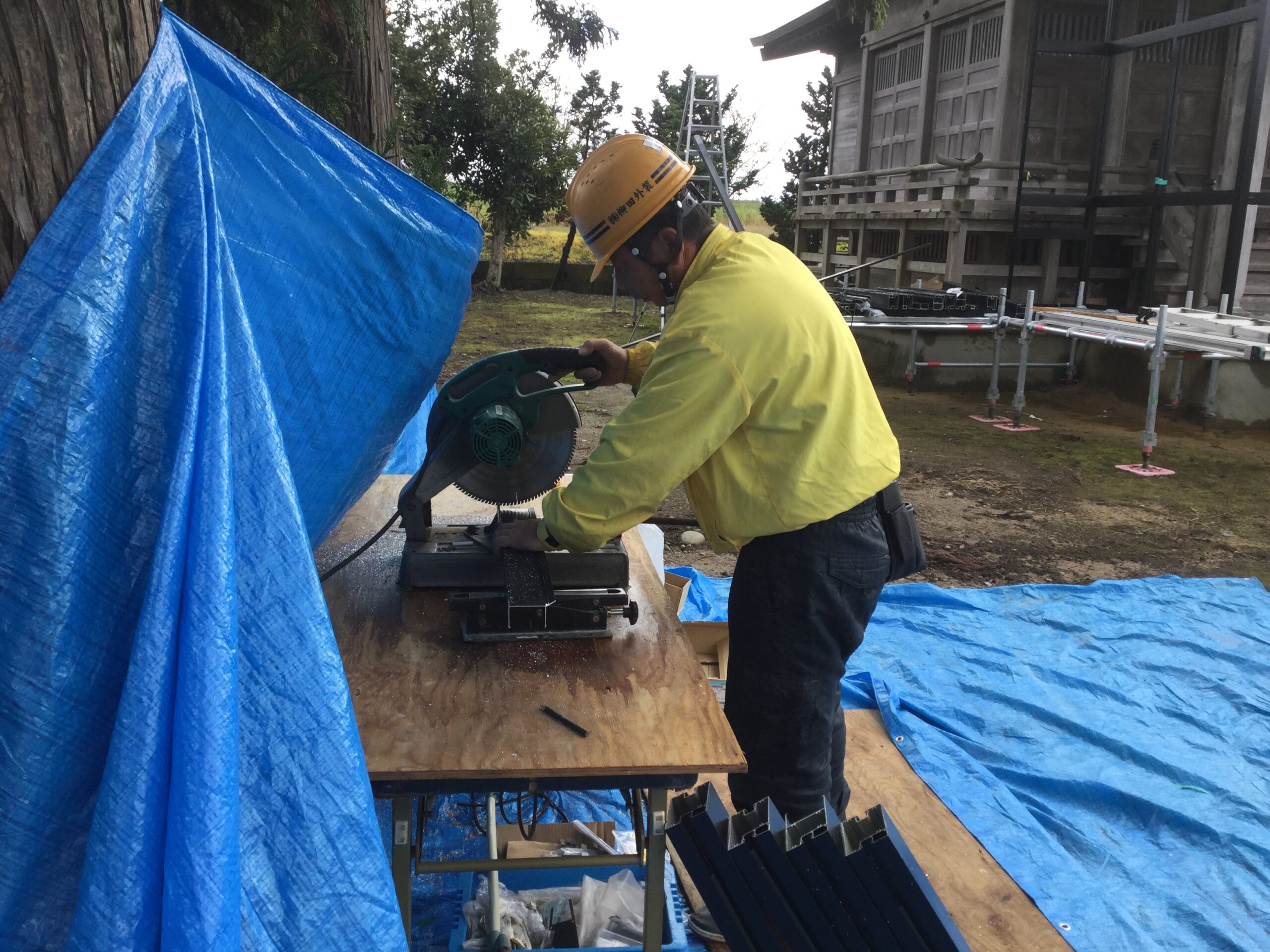 工事は神社の敷地内を一部借りて現場で一枠づつ切断加工し組み立てました。